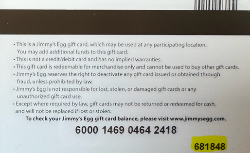 If your gift card has a six-digit PIN code, like the one shown here (e.g., 681848), you can check your balance here.