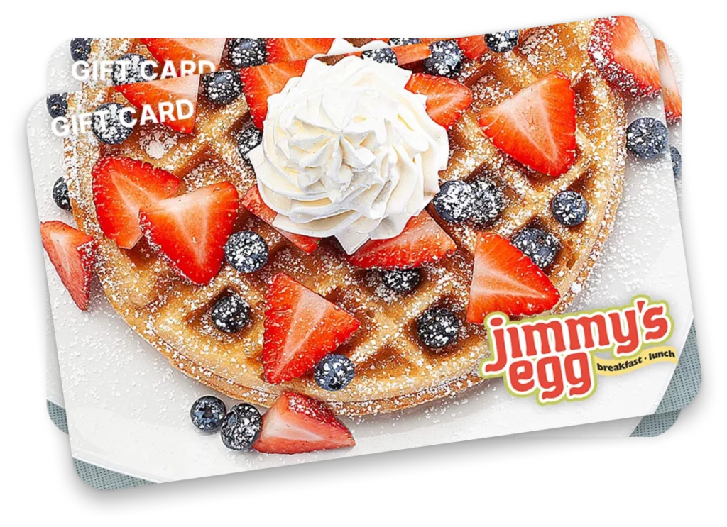 This gift card may be used towards the cost of food and/or beverage at any participating Jimmy’s Egg locations. This is a gift card, not a credit or debit card. Jimmy’s Egg reserves the right to deactivate any gift card issued or obtained through fraud, unless prohibited by law. Jimmy’s Egg is not responsible for lost, stolen or damaged gift cards or any unauthorized gift card use. Except where prohibited by law, gift cards will not be replaced if lost or stolen and no cash or change will be given.